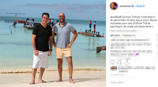 Survivor 2019 için geri sayım başladı! TV8 kanalının sahibi yapımcısı ve sunucusu Acun Ilıcalı, ‘Survivor Türkiye-Yunanistan’ yarışmasının çekimlerinin başladığını hayranlarına duyurdu. Acun Ilıcalı, yakın arkadaşı Esat Yontuç ile çekilen fotoğrafını sosyal medya hesabından paylaştı. Başarılı televizyoncu, instagram’da yayınladığı kareye, “Survivor Türkiye-Yunanistan’ın ilk çekiminden ilk kare, hayırlı olsun. Büyük mücadele yarın saat 20.00’de TV8’de kaçırmayın. Bu arada yok böyle deniz” notunu ekledi…