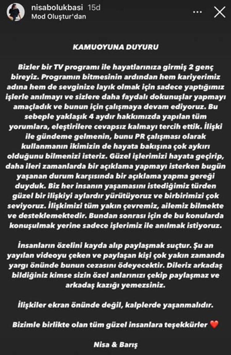 Sosyal medyada gündem olan gömrüntülerin ardından açıklama yapan Barış ile Nisa, “Bizler bir TV programı ile hayatlarınıza girmiş 2 genç bireyiz. Programın bitmesinin ardından hem kariyerimiz adına hem de sevginize layık olmak için sadece yaptığımız işlerle anılmayı ve sizlere daha faydalı dokunuşlar yapmayı amaçladık ve bunun için çalışmaya devam ediyoruz. Bu sebeple yaklaşık 4 aydır hakkımızda yapılan tüm yorumlara, eleştirilere cevapsız kalmayı tercih ettik. İlişki ile gündeme gelmenin, bunu PR çalışması olarak kullanmanın ikimizin de hayata bakışına çok aykırı olduğunu bilmenizi isteriz. Güzel işlerimizi hayata geçirip, daha ileri zamanlarda bir açıklama yapmayı isterken bugün yaşanan durum karşısında bir açıklama yapma gereği duyduk. Biz her insanın yaşamasını istediğimiz türden güzel bir ilişkiyi aylardır yürütüyoruz ve birbirimizi çok seviyoruz. İlişkimizi tüm yakın çevremiz, ailemiz bilmekte ve desteklemektedir. Bundan sonrası için de bu konularda konuşulmak yerine sadece işlerimiz ile anılmak istiyoruz” dedi.