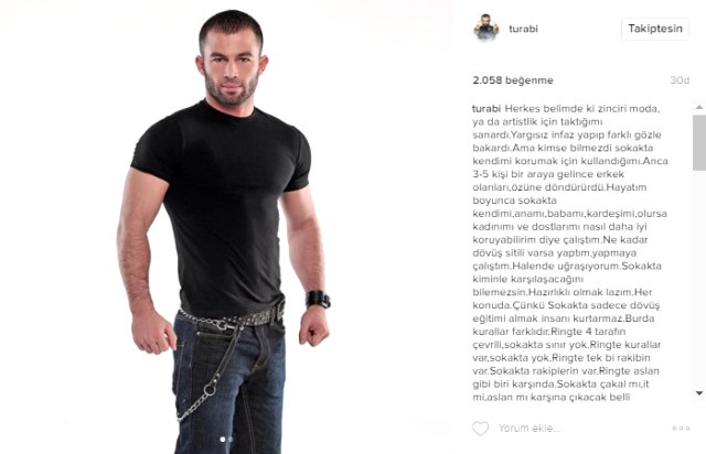 Turabi Çamkıran, paylaşımına “Herkes belimde ki zinciri moda, ya da artistlik için taktığımı sanırdı. Yargısız infaz yapıp farklı gözle bakardı. Ama kimse bilmezdi sokakta kendimi korumak için kullandığımı. 3-5 kişi bir araya gelince erkek olanları,özüne döndürürdü.Hayatım boyunca sokakta kendimi,anamı,babamı,kardeşimi,olursa kadınımı ve dostlarımı nasıl daha iyi koruyabilirim diye çalıştım. Ne kadar dövüş sitili varsa yaptım, yapmaya çalıştım. Hala da uğraşıyorum. Sokakta kiminle karşılaşacağını bilemezsin. Hazırlıklı olmak lazım. Her konuda. Çünkü Sokakta sadece dövüş eğitimi almak insanı kurtarmaz. Burada kurallar farklıdır. Ringte 4 tarafın çevrili, sokakta sınır yok. Ringte kurallar var,sokakta yok. Ringte tek bi rakibin var. Sokakta rakiplerin var. Ringte aslan gibi biri karşında. Sokakta çakal mı,it mi,aslan mı karşına çıkacak belli değil. Ringte sana karşı kullanılacak silahlar rakibinin vücudu. Sokakta rakibin hangi silahı kullanacak belli değil. Ringte rakibin hep karşında ve ne zaman saldıracağını duyuran zil sesi var. Sokakta ne rakibinin çıkacağı yer belli ne de saldıracağı zaman. Ringte yere düştün mü seni koruyup ayıracak hakemin var. Sokakta yere düştünmü seni ayıracak kimse yoktur. Tepende kaç kişinin seni tekmeleyeceği belli değil. Ringte rakibini dövdün mü iş orada biter. Sokakta birini dövdün mü sana kaç kişi olarak ve nasıl geri geleceğini bilemezsin. Ringteki rakibin bellidir, bilirsin. Sokakta kimin kim olduğunu bilemezsin. Ringte büyük darbe aldın mı seni hemen hastaneye yetiştirecek ambulansın kapıdadır ve ilk müdahaleyi yapmak için doktor yanı başındadır. Sokakta vuruldun mu ne ambulans vardır ne de doktor. Kaderinle başbaşasındır. Hayatında hiç yumruk atmamış birini iyi bir hocayla 1 senede en kral dövüşçü yapabilirsin ama hiç kimseye cesareti ve aklı öğretemezsin. “Herşey taklit edilebilir, cesaret ve zeka asla.” Kavga,dövüş ringlerde güzel. Onun dışında hiç değil. Aileniz ve ekmeğiniz için kavganızı verin. Küçüklerinizi sevin ve bir kadına asla el kardırmayın. Öyle racon keserek,başkalarının hayatını sorgulayarak, meslekle, cinsiyetle, birilerini döverek ya da adam öldürerek adam olunmuyor. Akşam eve ekmeğini götürebiliyorsan, aileni ve kendini kimseye muhtaç etmiyorsan adamsın!” yazdı.