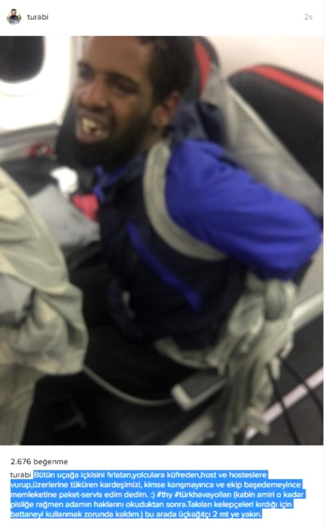 “Bütün uçağa içkisini fırlatan, yolculara küfreden, host ve hosteslere vurup üstlerine tüküren kardeşimize, kimse karışmayınca ve ekip baş edemeyince memleketine paket-servis edeyim dedim. THY kabin amiri o kadar pisliğe rağmen adamın haklarını okuduktan sonra, takılan kelepçeleri kırdığı için battaniye kullanmak zorunda kaldım. Bu arada üçkağıtçı 2 metreye yakın.”