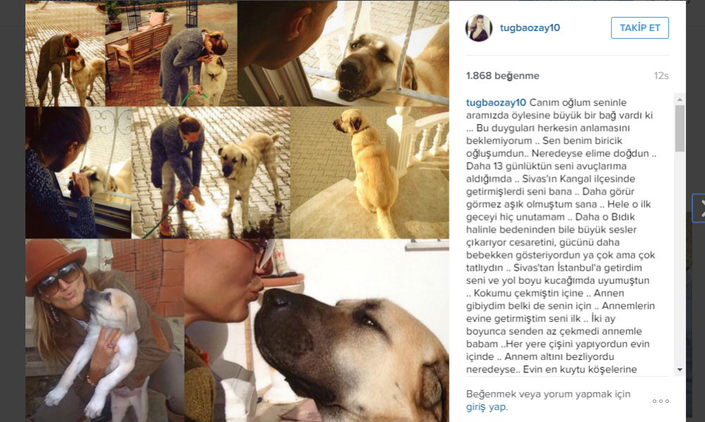İşte Tuğba Özay’ın köpeği için yazdığı o not: “Canım oğlum seninle aramızda öylesine büyük bir bağ vardı ki… Bu duyguları herkesin anlamasını beklemiyorum. Sen benim biricik oğluşumdun. Neredeyse elime doğdun. Daha 13 günlüktün seni avuçlarıma aldığımda. Sivas’ın Kangal ilçesinde getirmişlerdi seni bana. Daha görür görmez aşık olmuştum sana. Hele o ilk geceyi hiç unutamam. Daha o Bıdık halinle bedeninden bile büyük sesler çıkarıyor cesaretini, gücünü daha bebekken gösteriyordun ya çok ama çok tatlıydın. “Az çekmedi annemle babam” Sivas’tan İstanbul’a getirdim seni ve yol boyu kucağımda uyumuştun. Kokumu çekmiştin içine. Annen gibiydim belki de senin için. Annemlerin evine getirmiştim seni ilk. İki ay boyunca senden az çekmedi annemle babam. Her yere çişini yapıyordun evin içinde. Annem altını bezliyordu neredeyse. Evin en kuytu köşelerine giriyor nerede olduğunu bulamıyorduk bir türlü minnacık halinle. “Güçlüydün, yenilmezdin” Hele ki annemin kucağında oturup da televizyon izlediğin günü hiç unutamam. Bayılmıştık ailece o şirinliğine. Sonra seni çiftliğimize götürdük. Asıl yuvana kavuşmuştun artık. Arkadaşların oldu orada. Hera, Herkül, Bızdık, Puki. Hepsiyle çok iyi anlaşmıştın. Herkül’le oyunlar oynuyordun. Büyüyünce de Hera’ya aşık oldun. Hera melek olup gittiğinde yemeden içmeden kesildin .. Sonra toparladın kendini . Sen güçlüydün..! Sen yenilmezdin..! Bir o kadar da duygu yüklüydün. Cesurdun, koruyucuydun. Beni kimseyle paylaşamaz kimseyi yanıma yaklaştırmazdın. “Elbet bir gün buluşacağız” Sen gezerken kimse çıkamazdı bile dışarıya. Büyüdükçe devleştin. Çok güzel anılarımız oldu seninle. Hele o yaz gecelerinde ben bahçede yatarken senin de ayak ucumda nöbet tutman. Nasıl unutabilirim ki. Ben geldiğim Zamanlar Nasıl da havalara uçardın. Dost bildiklerim bile böyle içten sevinmiyordu. Sen canımdın benim. Dostumsun oğluşumdun. Sana asla köpek denmedi. Sen Zeus’tun. Meğer ben çok uzaklardayken 24 şubatta hem de tam babaannemin vefat ettiği tarihte melek olmuşsun. Söylememişler bana. Anıların daima ışık olacak ve her daim tebessümle anacağım seni. Seni çok sevdim. Çok seviyorum. Hep seveceğim. Elbet bir gün seninle de buluşacağız. Tüm kaybettiğim sevdiklerimle olacağı gibi. Hoşçakal bebeğim Zeus”