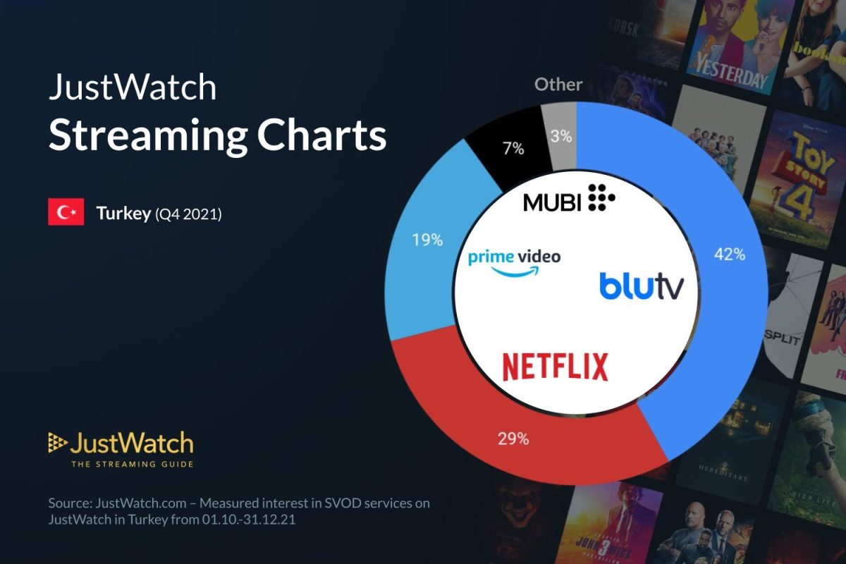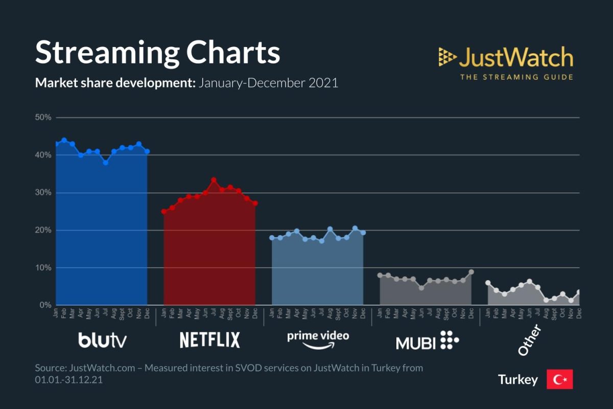 Her çeyrekte olduğu gibi 2021’in 4. çeyreğinde de Netflix, Prime Video, Disney+ vb. için ayrıntılı bir performans incelemesi yapıldı. Yapılan araştırmalar sonucunda yayımlanan verilere göre 2021’in 4. çeyreğinde SVOD pazar payları BluTV, pazar payına +%2 ekleyerek 4. çeyrekte hakim olmaya devam etti. Prime Video +%1 ekledi, Netflix ise çeyreği -%3 pazar kaybıyla kapattı.