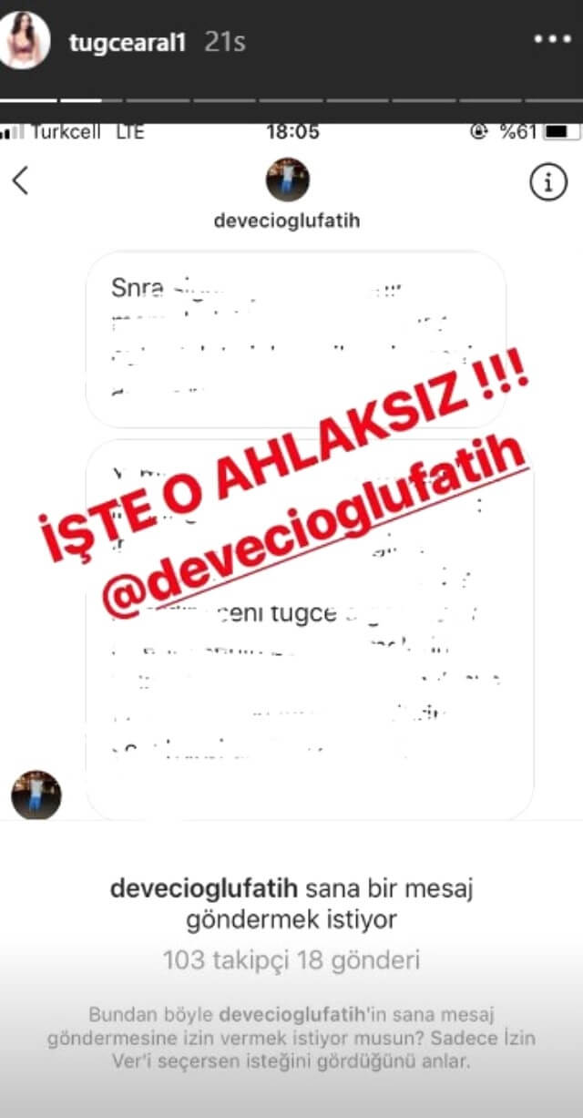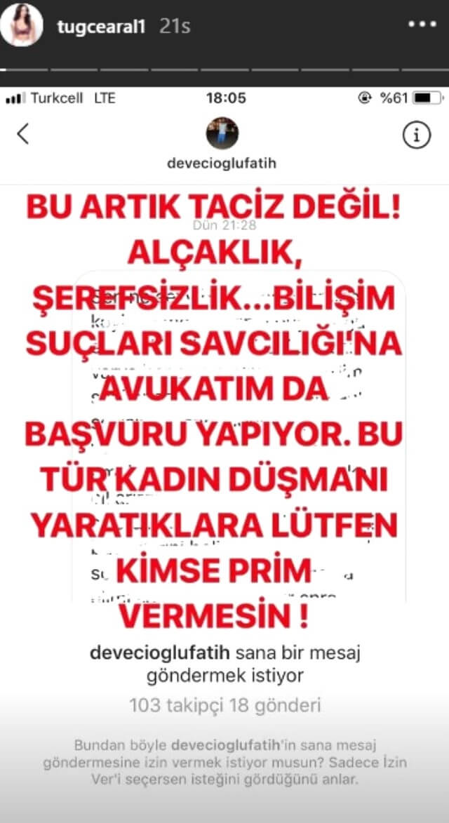 Ünlü manken Tuğçe Aral, sosyal medya hesabından bir kullanıcı tarafından taciz edildi. Ağza alınmayacak şekilde sözler ile taciz edilen Aral, kendisini taciz eden kullanıcıyı ifşa etti. Aldığı ekran görüntülerini sosyal medya hesabından paylaşan Tuğçe Aral, kişinin fotoğrafı ve profili ile birlikte yaptığı paylaşıma “Bu artık taciz değil. Şerefsizlik. Bilişim suçları savcılığına avukatım da başvuru yapıyor. Bu Türk kadın düşmanı yaratıklara kimse lütfen prim vermesin.” notunu ekledi.
