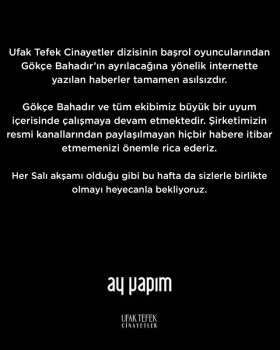“Ufak Tefek Cinayetler dizisinin başrol oyuncularından Gökçe Bahadır’ın diziden ayrılacağına yönelik internette yazılan haberler tamamen asılsızdır. Gökçe Bahadır ve tüm ekibimiz büyük bir uyum içerisinde çalışmaya devam etmektedir. Şirketimizin resmi kanallarından paylaşılmayan hiçbir habere itibar etmemenizi önemli rica ederiz. Her salı akşamı olduğu gibi bu hafta da sizlerle birlikte olmayı heyecanla bekliyoruz.” Açıklamasıyla, izleyicilere müjde verdi.