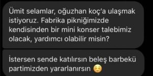 Müzisyen Oğuzhan Koç ile iletişime geçmeye uğraşan takipçisi, Ümit Erdim’ e yolladığı mesajda “Ümit selamlar, Oğuzhan Koç ‘a ulaşmak istiyoruz. Fabrika pikniğimizde kendisinden mini bir konser talebimiz olacak. Yardımcı olabilir misin?” şeklinde soru sordu…