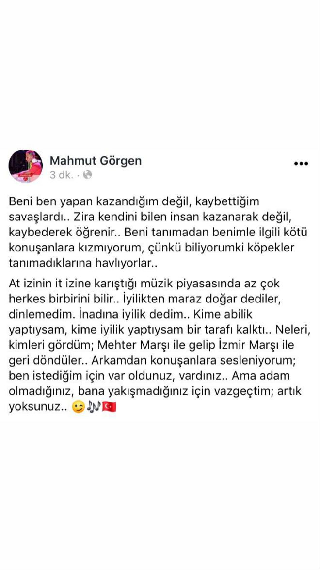 Her yaptığı ve her paylaşımı ile son dönemlerde gündemden düşmeyen Dj Mahmut Görgen sosyal medya hesaplarından yaptığı paylaşımlarla isyan bayrağını çekmiş gibi görünüyor. Sosyal medya hesabını aktif kullanan ve oldukça fazla takipçisi olan Görgen, en son sosyal medya hesabı üzerinden yaptığı paylaşımda, iyilik yaptığı herkesten kötülük bulduğuna değinen genç aranjör; ”Beni ben yapan kazandığım değil, kaybettiğim savaşlardı.. Zira kendini bilen insan kazanarak değil, kaybederek öğrenir.. Beni tanımadan benimle ilgili kötü konuşanlara kızmıyorum, çünkü biliyorum ki köpekler tanımadıklarına havlıyorlar.. At izinin it izine karıştığı müzik piyasasında az çok herkes birbirini bilir.. İyilikten maraz doğar dediler, dinlemedik. İnadına iyilik dedik.. Kime ağabeylik yaptıysam, kime iyilik yaptıysam bir tarafı kalktı.. Neleri, kimleri gördüm; Mehter Marşı ile gelip İzmir Marşı ile geri döndüler.. Arkamdan konuşanlara sesleniyorum; ben istediğim için var oldunuz, vardınız.. Ama adam olmadığınız, bize yakışmadığınız için vazgeçtim; artık yoksunuz..” paylaşımında bulundu.