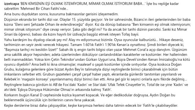 Oysa oyuncular kalburüstü… Hikaye deseniz, tarihimizin en keyifli, en seyir zevki verecek hikayesi… Tamam 1.60’lık Fatih’i 1.90’lık Kenan’a oynattınız. Şimdi birileri diyecek ki, “Sen de başımıza tarihçi mi kesildin İzzet!”