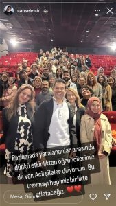 Saldırıdan Kıl payı kurtulduğunu açıklayan oyuncu Cansel Elçin, patlamanın hemen ardından yayınladığı bir paylaşımda saldırı yerine çok yakın bir yerde olduğunu ifade ederek, “İstiklal ‘de hemen yanımızda büyük bir patlama oldu. Ben iyiyim, umarım can kaybı yoktur” dedi. Diğer taraftan ünlü oyuncu, Beyoğlu ‘ndaki saldırıda yaralanan insanlar arasında öğrencilerinin de bulunduğunu açıkladı…