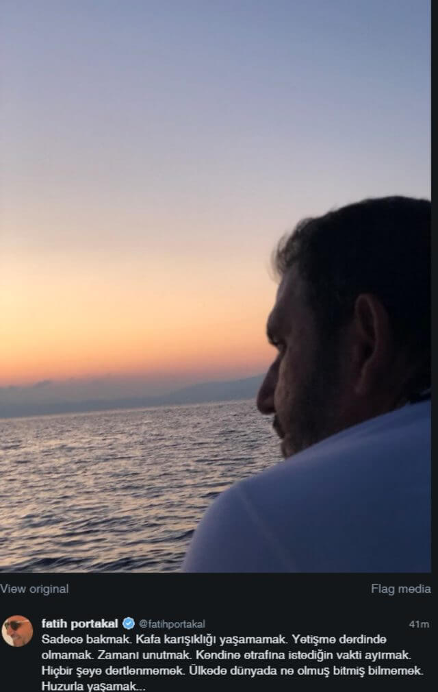 Fatih Portakal, tatilin tadını çıkartırken paylaşım yapmaktan da vazgeçemiyor. Son yaptığı paylaşım ile ise yine gündemde yerini aldı. İşte Paylaşım: Sadece bakmak. Kafa karışıklığı yaşamamak. Yetişme derdinde olmamak. Zamanı unutmak. Kendine etrafına istediğin vakti ayırmak. Hiçbir şeye dertlenmemek. Ülkede dünyada ne olmuş bitmiş bilmemek. Huzurla yaşamak…