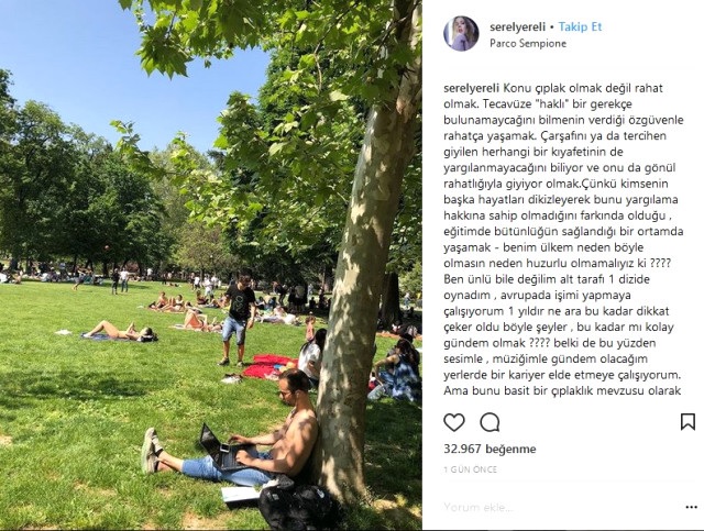 Ünlü oyuncu, yine sosyal medya hesabından bir parkta çimlerin üstünde üstsüz güneşlenen insanların fotoğrafını paylaşarak “Konu çıplak olmak değil rahat olmak. Tecavüze ‘haklı’ bir gerekçe bulunamaycağını bilmenin verdiği özgüvenle rahatça yaşamak. Çarşafını ya da tercihen giyilen herhangi bir kıyafetinin de yargılanmayacağını biliyor ve onu da gönül rahatlığıyla giyiyor olmak. Çünkü kimsenin başka hayatları dikizleyerek bunu yargılama hakkına sahip olmadığını farkında olduğu, eğitimde bütünlüğün sağlandığı bir ortamda yaşamak – benim ülkem neden böyle olmasın neden huzurlu olmamalıyız ki? Ben ünlü bile değilim alt tarafı bir dizide oynadım, Avrupa’da işimi yapmaya çalışıyorum 1 yıldır ne ara bu kadar dikkat çeker oldu böyle şeyler… Bu kadar mı kolay gündem olmak? Belki de bu yüzden sesimle, müziğimle gündem olacağım yerlerde bir kariyer elde etmeye çalışıyorum. Ama bunu basit bir çıplaklık mevzusu olarak asla görmedim! Çünkü benim ya da bir başkasının bedeni gözümde asla bir obje olmadı. Hadi şimdi beni rahat bırakın.” yazdı.