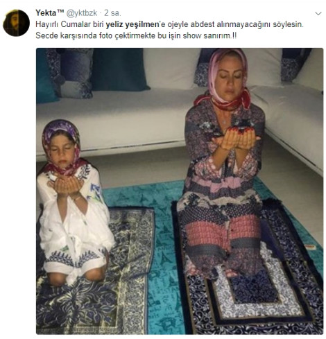 Oyuncu Yeliz Yeşilmen, Instagram hesabından kızı Asya ile namaz kılarken çekilmiş bir fotoğrafını paylaştı. Yeliz Yeşilmen’in tırnaklarının ojeli olmasına sosyal medya kullanıcıları “Ojeyle abdest alınmıyor” diyerek tepki gösterdi. Fotoğrafta Yeliz Yeşilmen’in tırnaklarının ojeli olması da dikkatli gözlerden kaçmadı. Yeliz Yeşilmen’in takipçileri ”Ojeyle abdest alınmıyor”, Biri Yeliz Yeşilmen’e ojeyle abdest alınmayacağını söylesin, Bir de çocuğa öğretmekten bahsediyor” gibi yorumlar yazınca Yeliz Yeşilmen tepkilere maruz kaldı.
