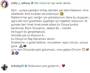 Atiksoy’a, eşi Oktay’dan kalp emojisiyle birlikte “Doldurdun yine gözlerimi” cevabı geldi. İsmail Ege Şaşmaz, Didem Balçın, Rüzgar Aksoy, Emre Basalak ve Burç Kümbetlioğlu gibi ünlü isimler de yazdıkları yorumlar ile oyuncunun doğum gününü kutladı.