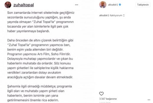 Zuhal Topal’ın yaşananlara ilişkin yaptığı açıklama şöyle: “Son zamanlarda internet sitelerinde geçtiğimiz sezonlarda sunuculuğunu yaptığım, şu anda yayında olmayan ‘ Zuhal Topal’la ‘ programının locasında yer alan isimlerle ilgili pek çok haber yayınlanmaya başlandı. Daha önceden de altını çizerek belirttiğim gibi ‘ Zuhal Topal’la’ programının yapımcı ben, benim eşim ya da ailemden biri değildir. Programın yapımcısı Artı Film ve Soho Film’dir. Dolayısıyla muhattap yapımcılardır ve çıkan bu haberlerin muhatabı da onlardır. Söz konusu yapım şirketleri ile sahiplerine kişilik haklarıma verdikleri zararlardan dolayı avukatım aracılığıyla açtığım davalar devam etmektedir.